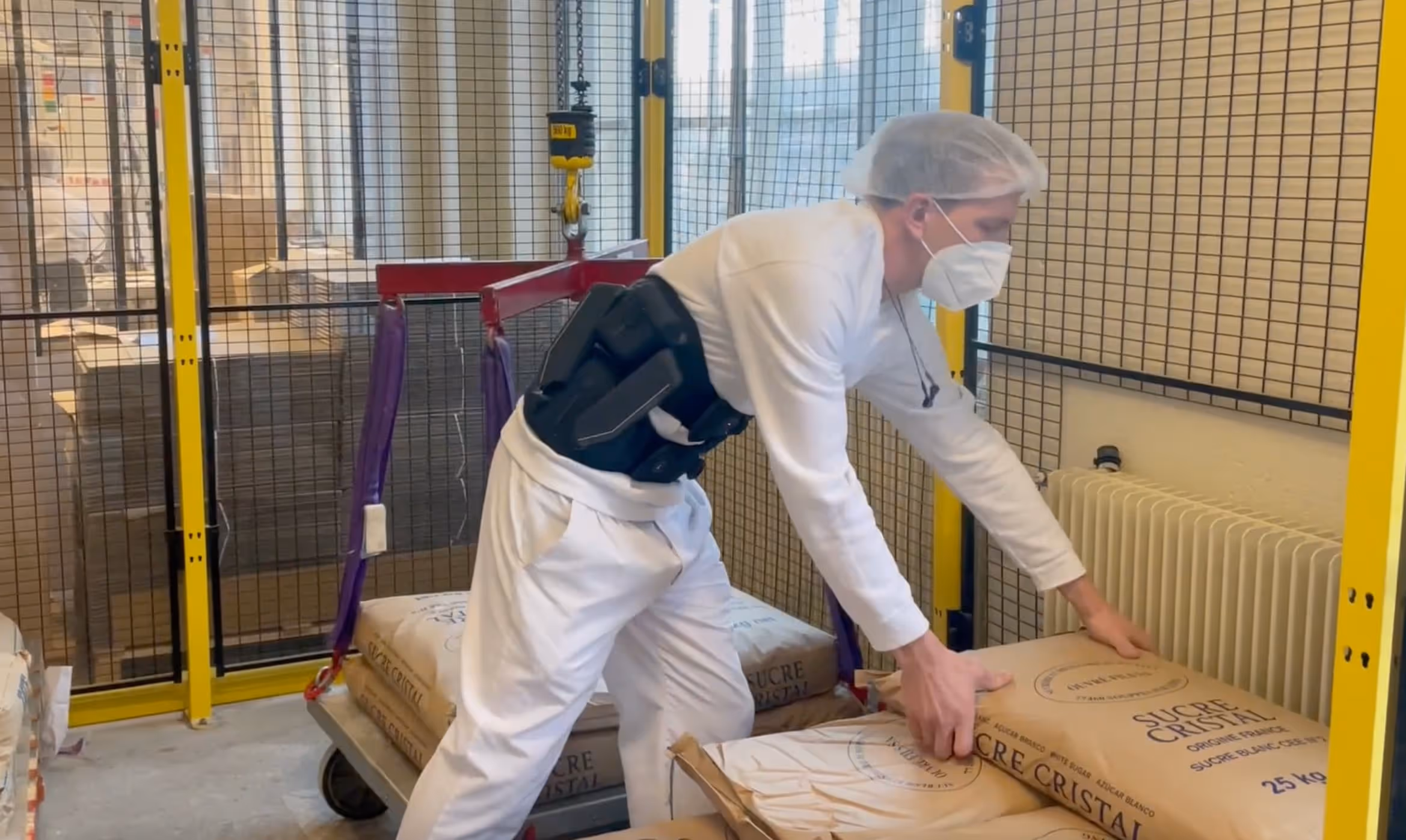 - Lubin qui peut plus facilement charger les sacs de sucre au RDC sur le monte-charge avec son exosquelette motorisé